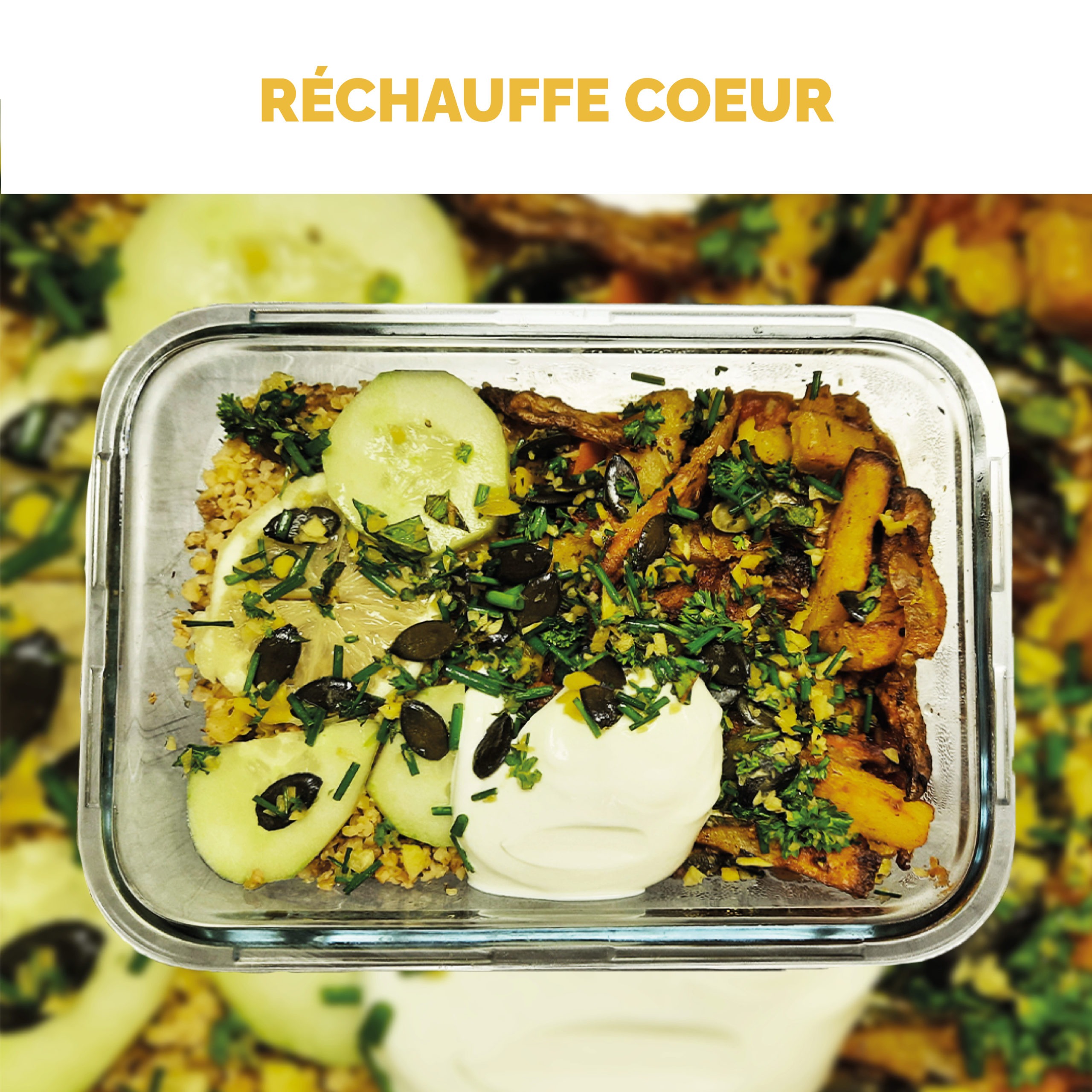 Boulgour au thym citronné, accompagné d’une ratatouille et de tofu haché sauté à l’ail frais.